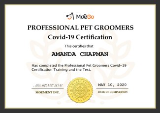 We have also taken the Barbicide COVID-19 Course and obtained the certification. The course presents the most current and pertinent information to the groomer. While this information changes, the guidelines will remain consistent in the short term, and will be followed by the groomer.